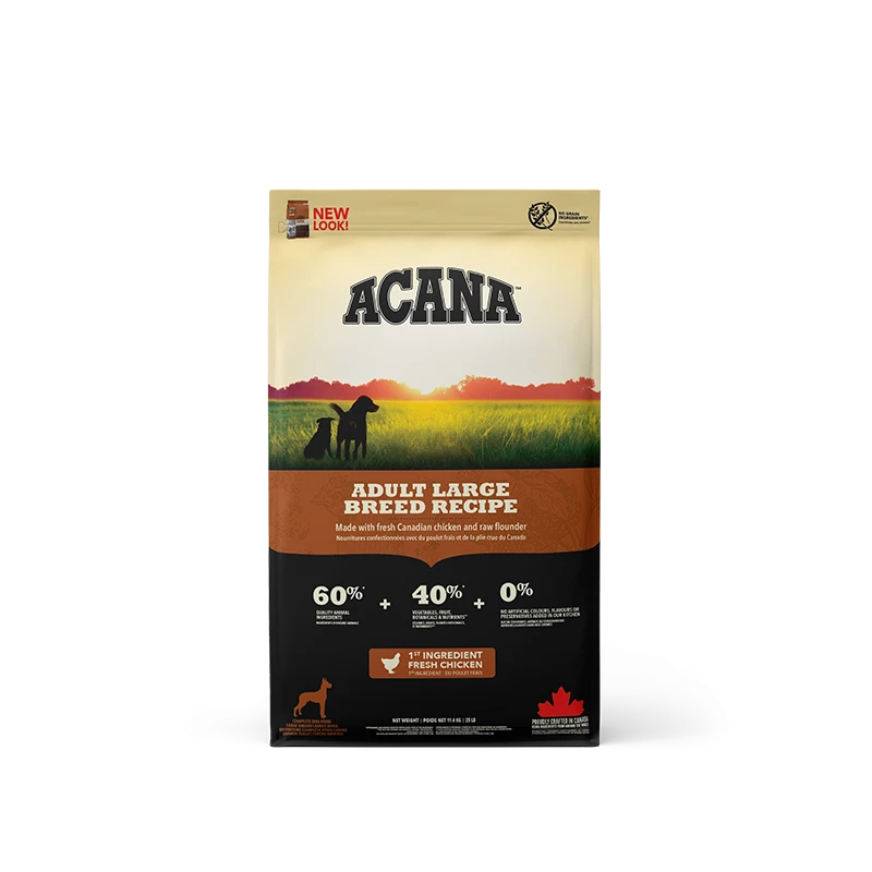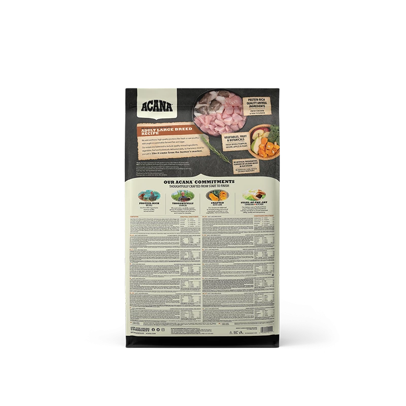 Bereid in onze gecertificeerde keukens in Canada is Acana Dog hondenvoer Adult Large Breed rijk aan lokaal gefokte scharrel kip, scharrel eieren, in het wild gevangen platvis, zongerijpt fruit en groenten- geleverd rijk aan voedingsstoffen en door boeren en telers uit onze eigen regio zodat jouw hond in optimale fysieke conditie blijft. Deze voeding is rijk aan dierlijk eiwit en minimaal in percentage koolhydraten.