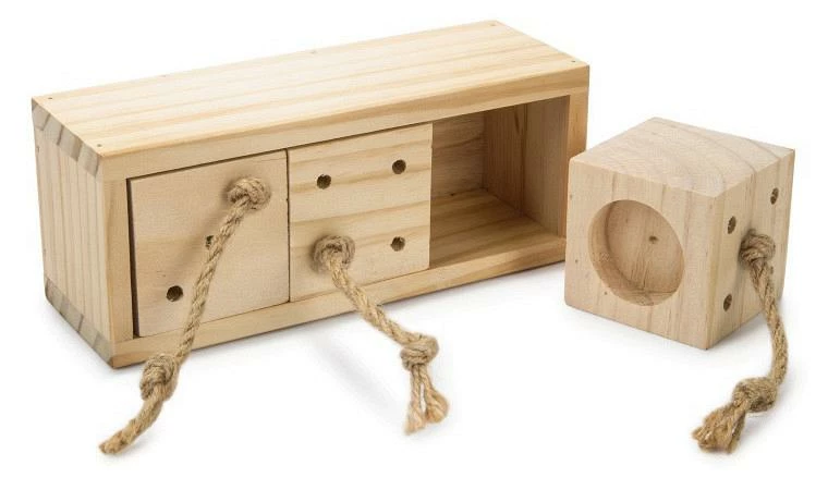 Het houten blokje kan omhoog worden gehaald door middel van het touwtje, waarna je er de favoriete traktatie van jouw knaagdier in kunt stoppen. Jouw knaagdier zal de traktatie eruit proberen te halen door aan het touwtje te trekken.