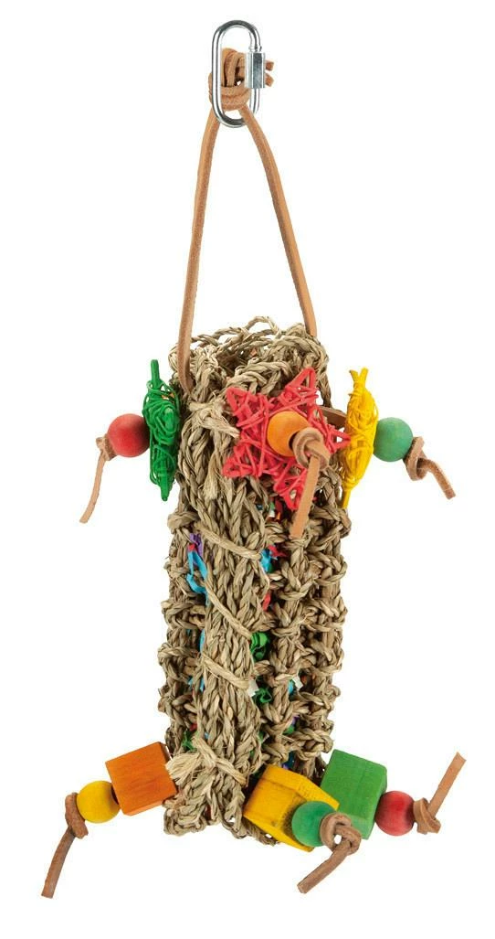 Het Beeztees Vogelspeelgoed Rika is een leuk hangspeeltje voor in de vogelkooi. Dit speeltje, gemaakt van gebreid gras, is aan de buitenkant afgewerkt met leuke houten blokjes en kralen. Eenvoudig op te hangen in de vogelkooi door middel van de leren touwtjes.