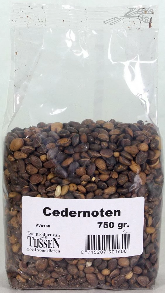 Cedernoten bevatten veel vet en zijn daardoor zeer voedzaam. Een nadeel is dat de schil dusdanig hard is, dat deze noten niet aan tuinvogels gevoerd kunnen worden. Parkieten, en met name papegaaien, zijn er dol op. Zij kunnen met hun krachtige snavel de pit wel kraken.
