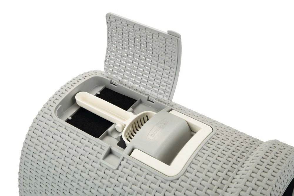 Een prachtig afgewerkte rotan kunststof kattenbak van Curver. Niet alleen een lust voor het oog maar ook zeer gemakkelijk in gebruik.