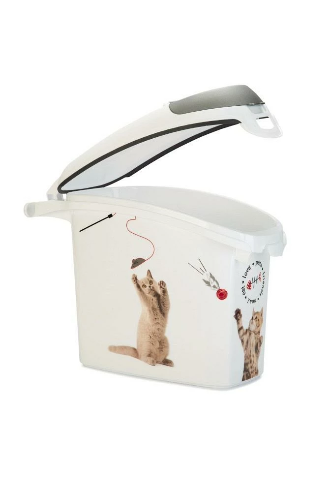 De container bevat een klepje aan de bovenkant, zodat je de brokjes gemakkelijk in een kattenvoerbak kunt schenken. Voorzien van een handvat, zodat je de voedselcontainer gemakkelijk kunt verplaatsen. Leuk detail: voorzien van diverse kattenprints.