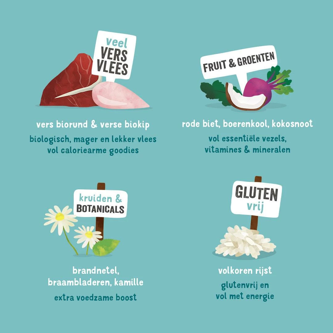 Samenstelling: Biologische verse kip* 25%, biologische volkorenrijst*, biologisch rijsteiwit*, biologische volkorengierst*, biologisch vers rund* 5%, biologisch kippenvet*, biologische varkenssaus*, mineralen, biologische tomaten* 0,04%, biologische wortels* 0,04%, biologische rode bieten* 0,04%, biologische boerenkool* 0,04%, biologische kokosnoot* 0,04%, biologische brandnetels*, biologische braambesblaadjes*, biologische venkel*, biologische karwij*, biologische kamille*, biologische melisse*.