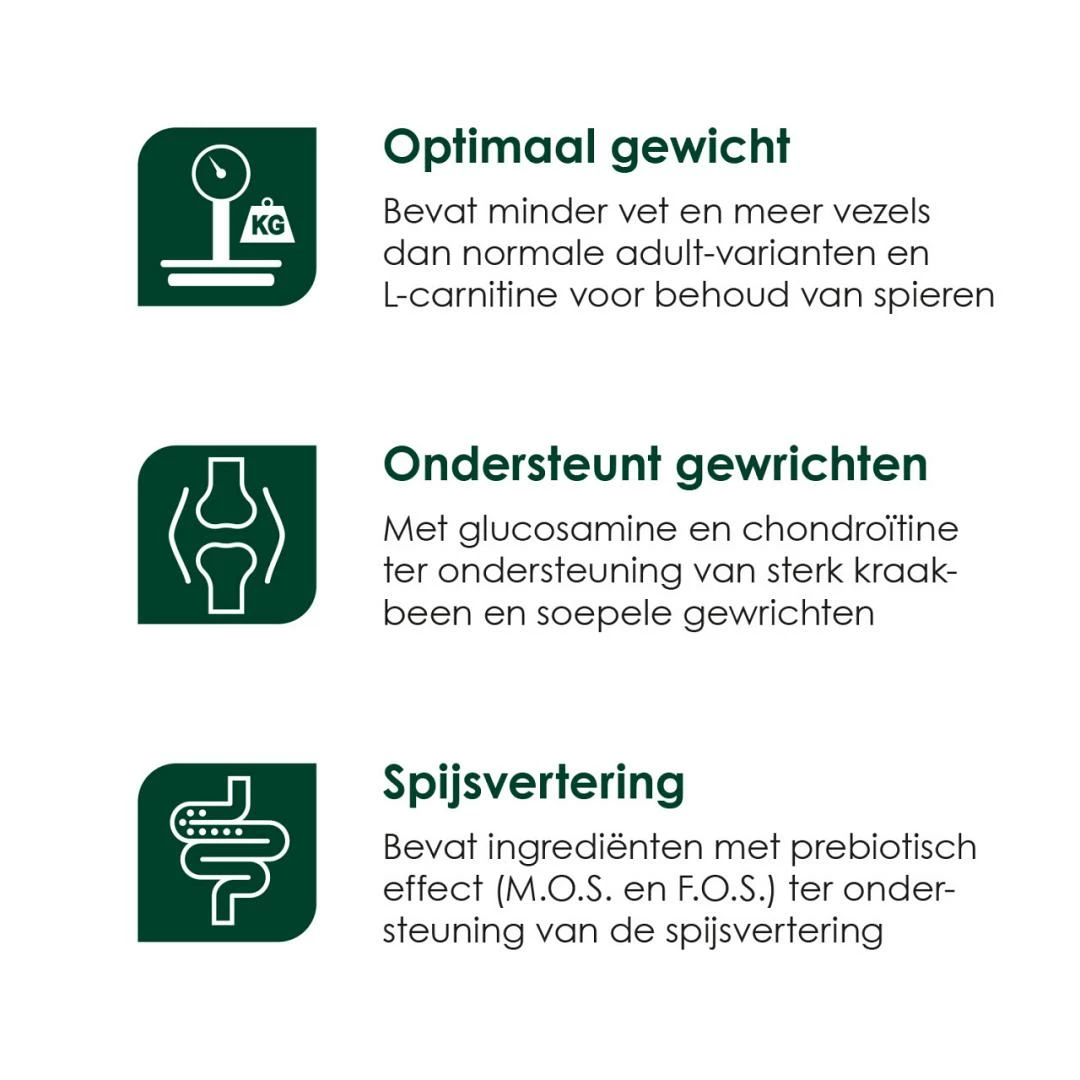 | Optimaal gewicht Bevat minder vet en meer vezels dan normale adult-varianten en L-carnitine voor behoud van spieren. | |
