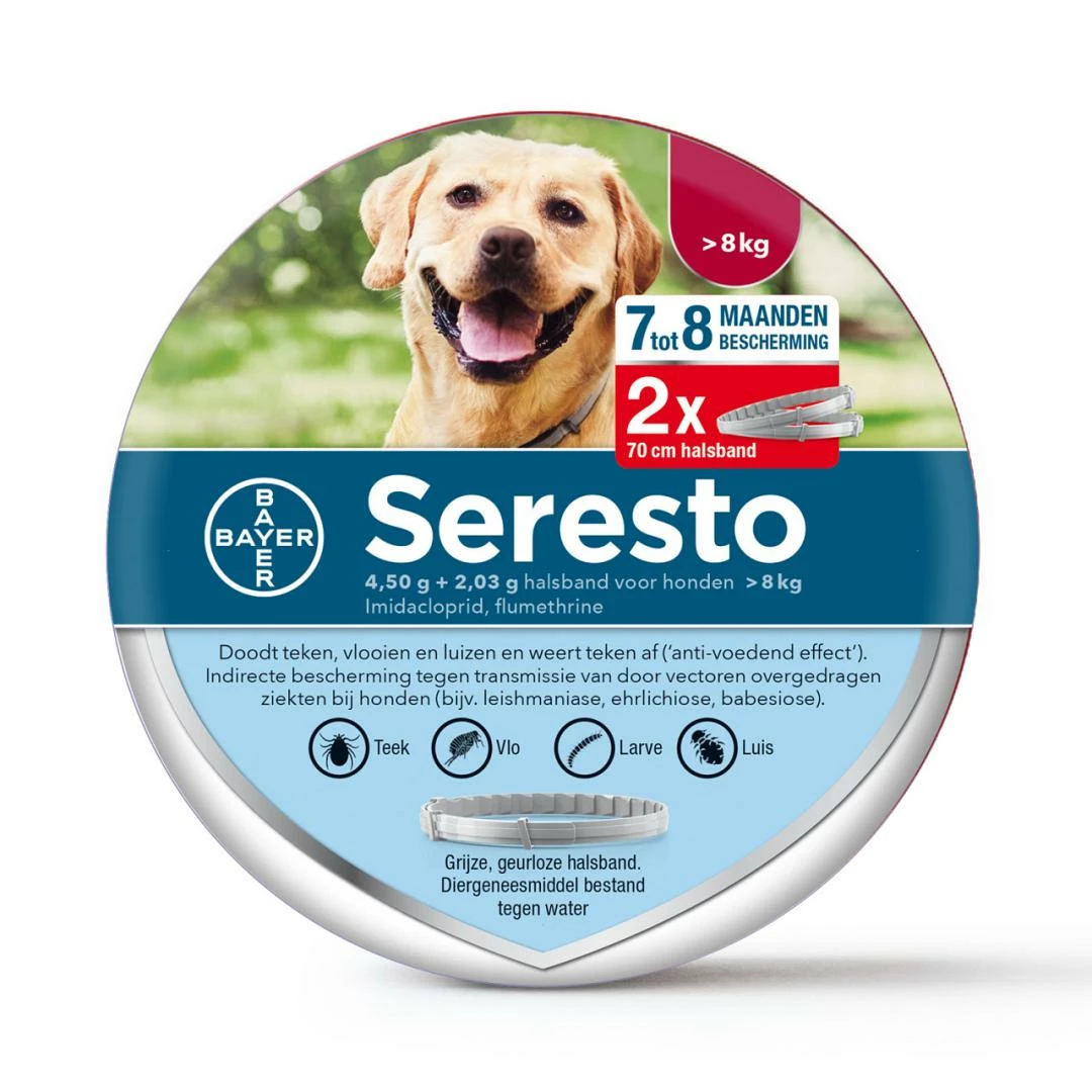 Seresto band voor grote honden is een innovatieve halsband tegen vlooien en teken jouw hond. Behandeling en preventie van vlooienbesmettingen gedurende 7 tot 8 maanden. De werkzaamheid tegen vlooien start onmiddellijk na het aanbrengen van de halsband. Seresto heeft een persisterende acaricide (dodelijke) doeltreffendheid tegen tekenbesmettingen (Ixodes ricinus, Rhipicephalus sanguineus) en afwerende (antivoedende) doeltreffendheid tegen tekenbesmettingen (Ixodes ricinus, Rhipicephalus) gedurende 8 maanden. De preventie van besmettingen met nieuwe teken start binnen de twee dagen na het aanbrengen van de halsband.