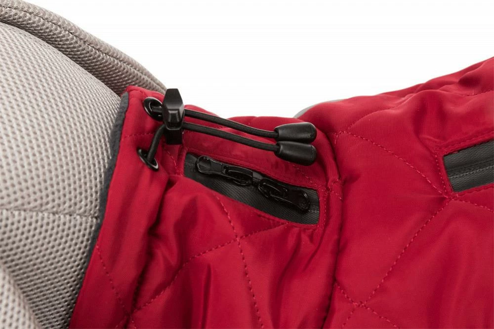 • met twee waterdichte ritssluitingen: bij de nek om riem aan halsband te bevestigen, op de rug om met tuig te combineren
